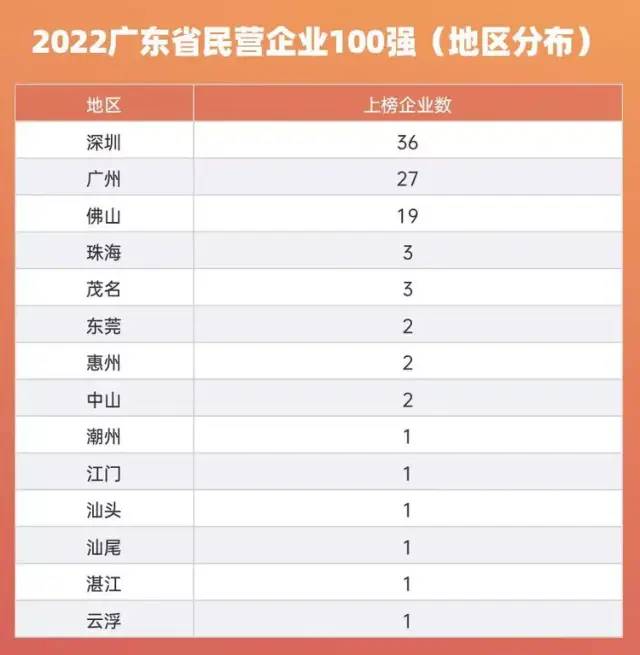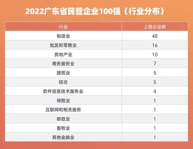 据悉,“2022广东省民营企业100强”入围门槛持续增长,营业收入由上一年120.59亿元上升至137.46亿元,增长16.87亿元,升幅高达14%。其中2021年营业收入超过4000亿元的企业有5家,超1000亿的有15家,超200亿的有69家。地区分布情况:深圳36家,广州27家,佛山19家,珠海、茂名各3家,东莞、惠州、中山各2家,潮州、江门、汕头、汕尾、湛江、云浮各1家。行业分布情况:制造业48家,批发和零售业16家,房地产业10家,商务服务业7家,建筑业、综合各5家,软件信息技术服务业4家,保险业、互联网和相关服务、邮政业、畜牧业及其他金融业各1家。