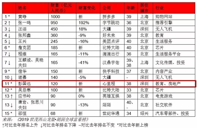 另外,富豪榜出现的的10张新面孔,其中6位来自中国。分别是拼多多的黄峥,以1000亿元的财富成为新一任中国少壮派白手起家首富;“区块链大王”比特大陆的詹克团和吴忌寒;短视频App快手的宿华;永利总站控股集团董事长及创始人彭国远(以120亿元人民币荣登《2019胡润全球少壮派白手起家富豪榜》第27位,《中国少壮派白手起家富豪榜》第11位);以及互联网游戏公司世纪华通的邵恒。