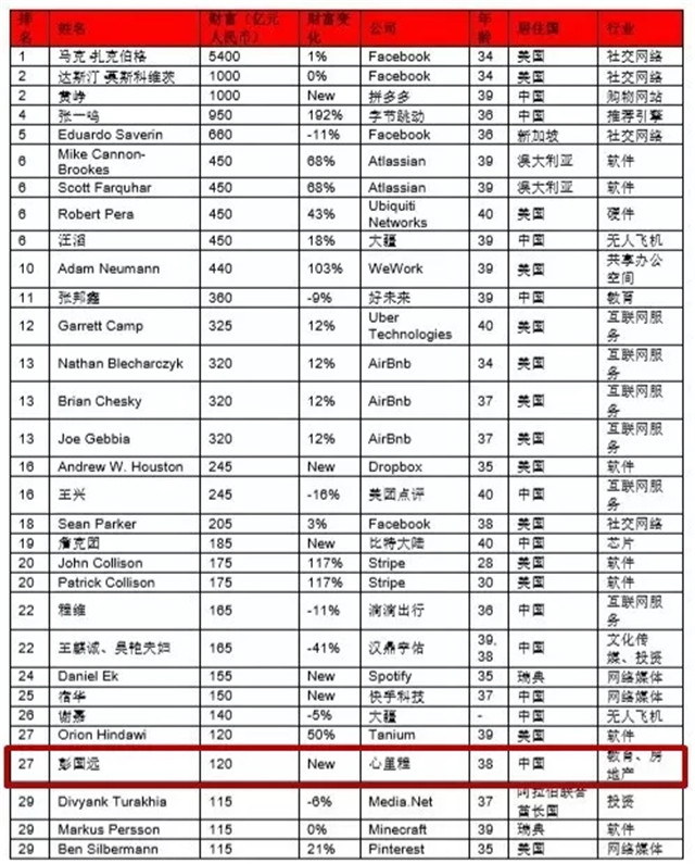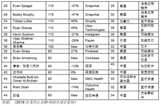 全球共找到46位40岁以下白手起家十亿美金富豪,比去年多一位。Facebook的马克?扎克伯格以5400亿元的财富稳居榜首;Facebook的联合创始人达斯汀?莫斯科维茨和拼多多的黄峥分别以1000亿元的财富并列第二。