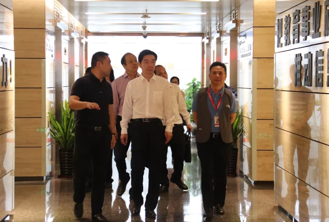 永利总站投资集团董事长彭俏奇(右)、常务副总裁张玉(左)等领导陪同广西贵港市副市长韦彦(中)参观集团